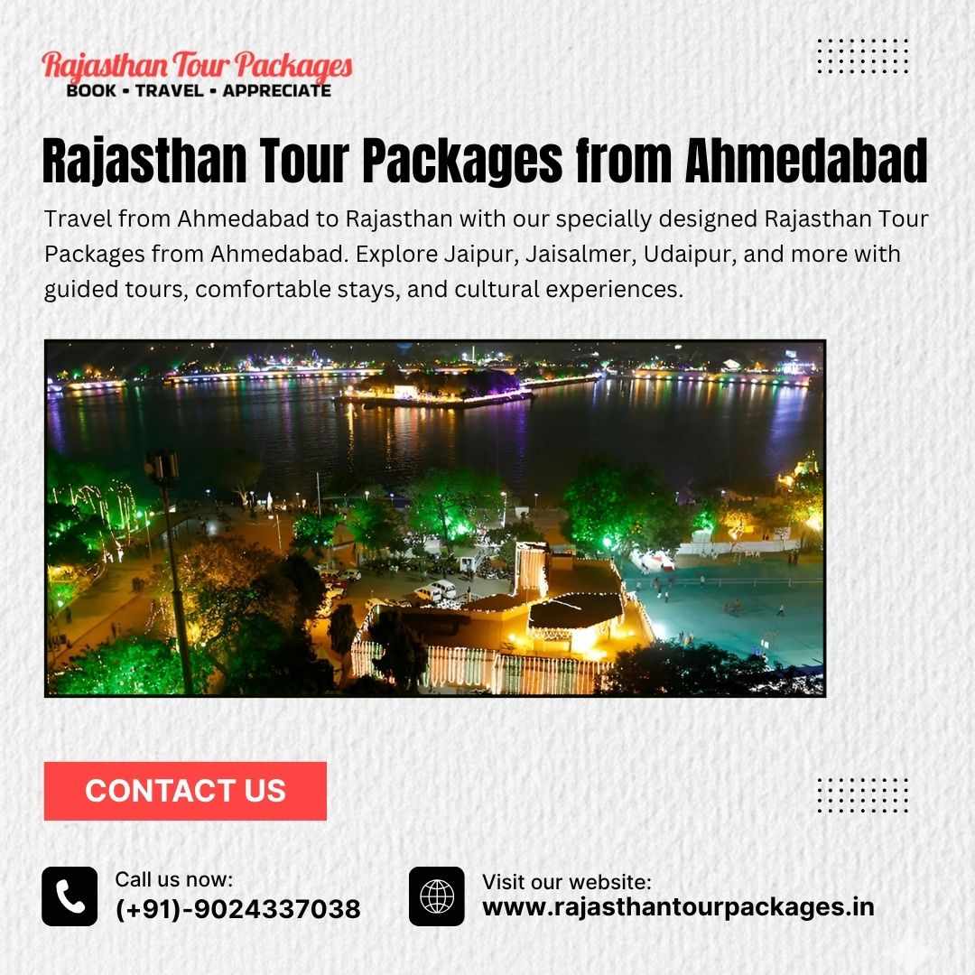 Travel from Ahmedabad to Rajasthan with our specially designed Rajasthan Tour Packages from Ahmedabad. Explore Jaipur, Jaisalmer, Udaipur, and more with guided tours, comfortable stays, and cultural experiences. These packages are ideal for families, friends, and couples seeking adventure, heritage, and luxury. Rajasthan Tour Packages ensure seamless travel, memorable experiences, and hassle-free itineraries from Ahmedabad.